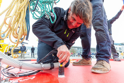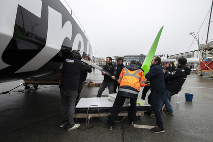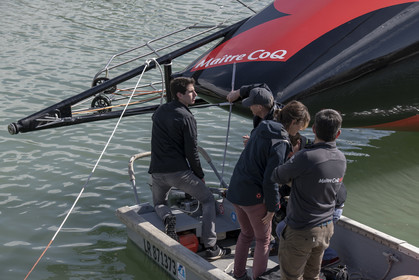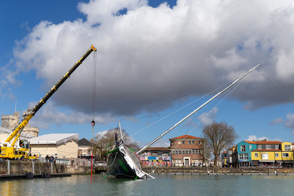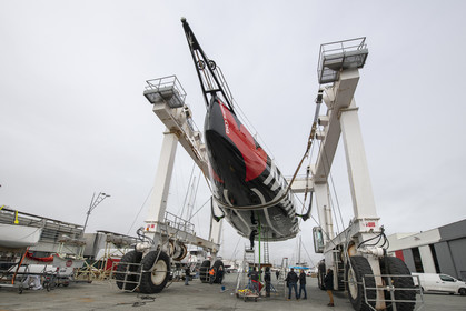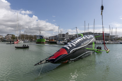 Selection d'images de la mise à l'eau et du test de redressement à 90° du voilier Imoca Maitre Coq du skipper Yannick Bestaven, à La Rochelle, les 11 et 13 Mars derniers. Le skipper et son bateau vont participer au Vendée Globe 2020.