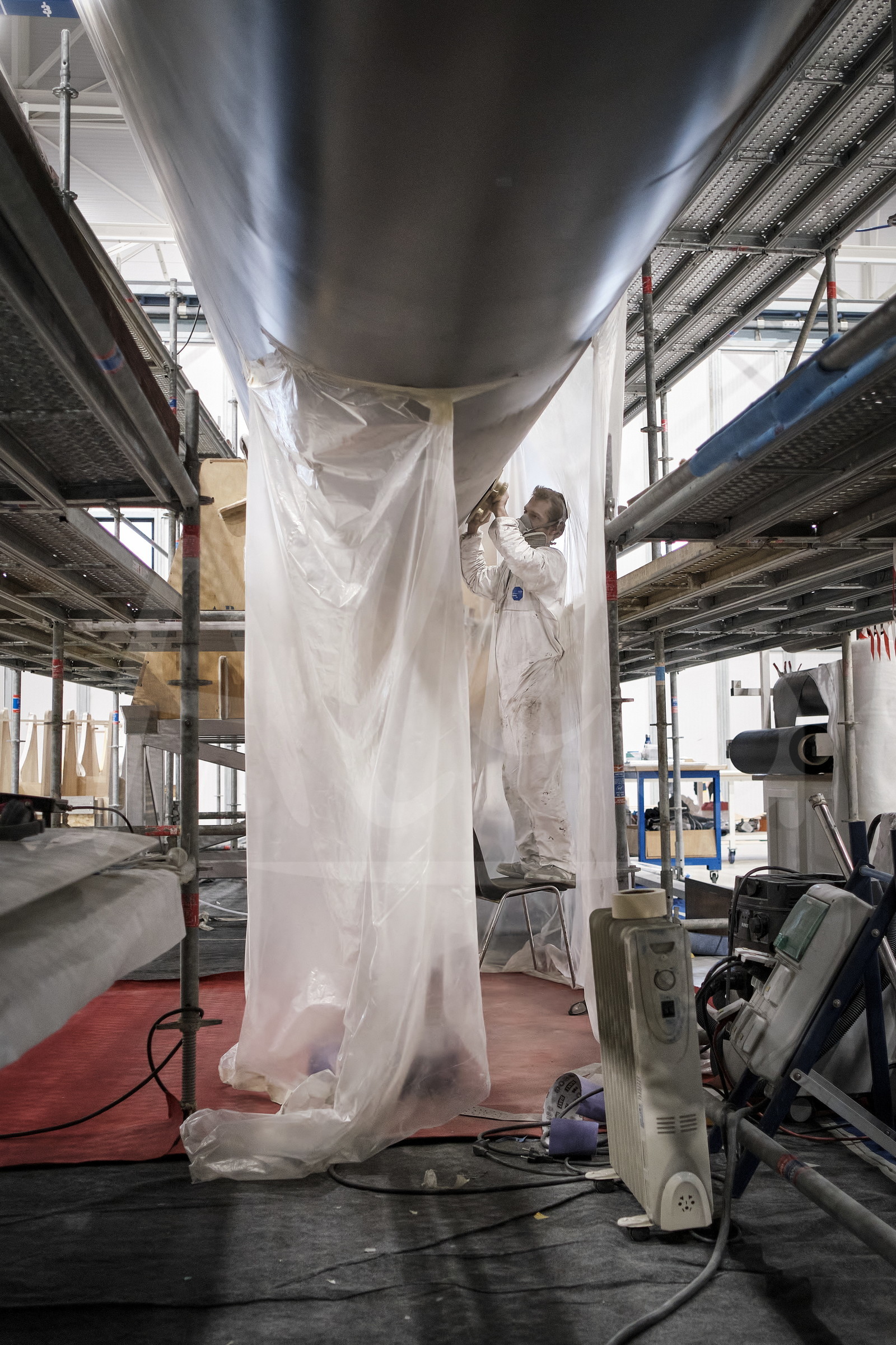 | Description | Construction du trimaran Ultim M101 (François Gabart) dans les locaux de Mer Concept à Concarneau le 21/01/2021 - Arrivée du bras avant construit chez CDK - Photo Benoit Stichelbaut / Alea |