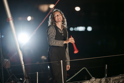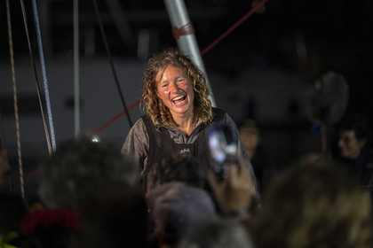 Arrival of the south african skipper Kirsten Neuschäfer, winner of the Golden Globe Race, round the world solo sailing race without any assistance or electronics, on April 27, 2023 in Les Sables d'Olonne. Photo Olivier Blanchet / Alea