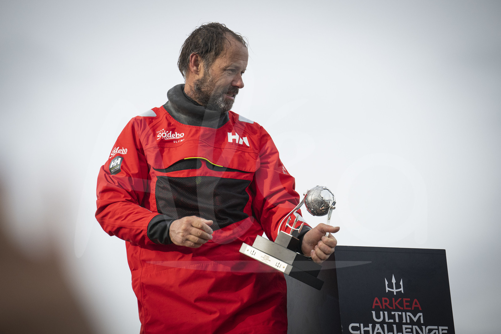 | Description | BREST, FRANCE - JANUARY 29: French skipper Thomas Coville on Sodebo Ultim 3 is pictured with trophy after taking second place of the Arkea Ultim Challenge Brest, on January 29, 2024 in Brest, France. (Photo by Vincent Curutchet/ALeA) |