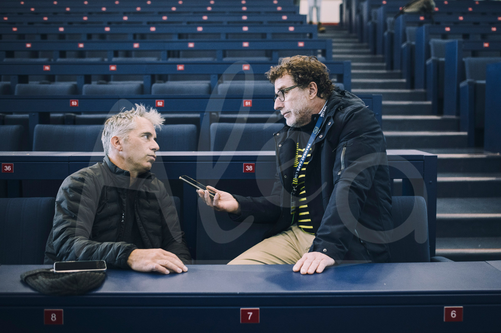 | Description | Skippers and teams, here Corentin Douguet being interviewed by Pierre Marie Bourguinat, are attending the race start briefing at the Transat Café L’Or village in Le Havre, France, on October 25, 2025. (Photo by Vincent Curutchet / Alea) |