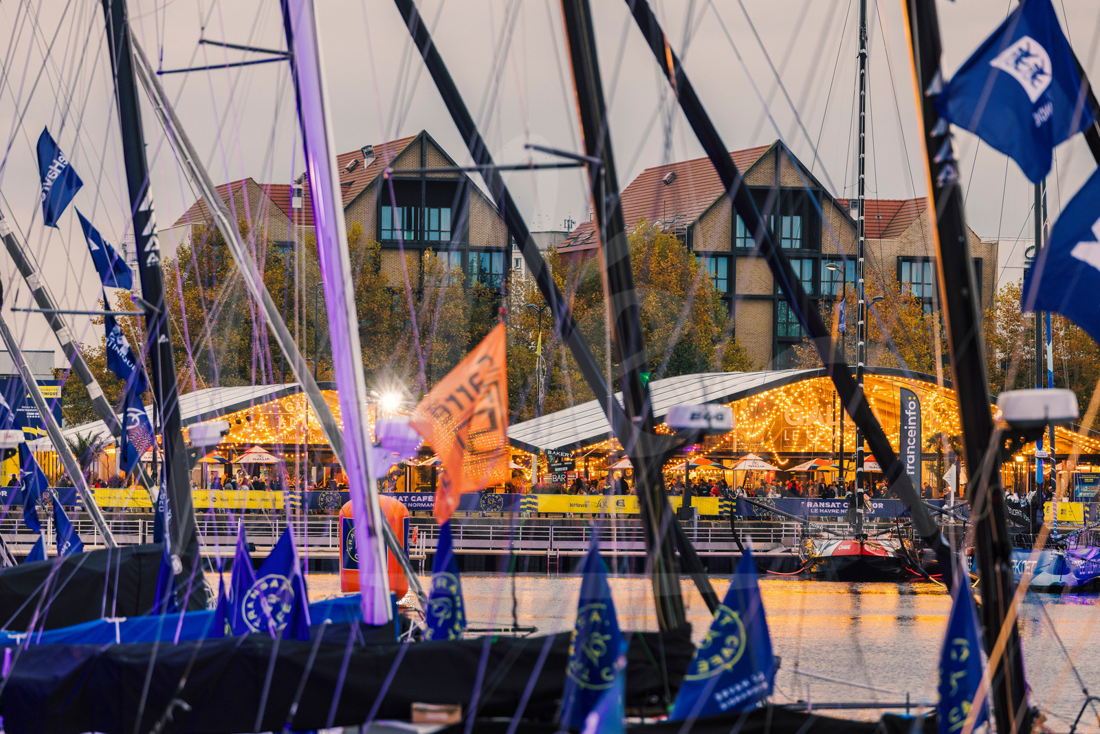 The Maison Hector brasserie is photographed at dusk in the Transat Café L’Or Village in Le Havre, France, on October 19, 2025. (Photo by Jean-Marie Liot / Alea)