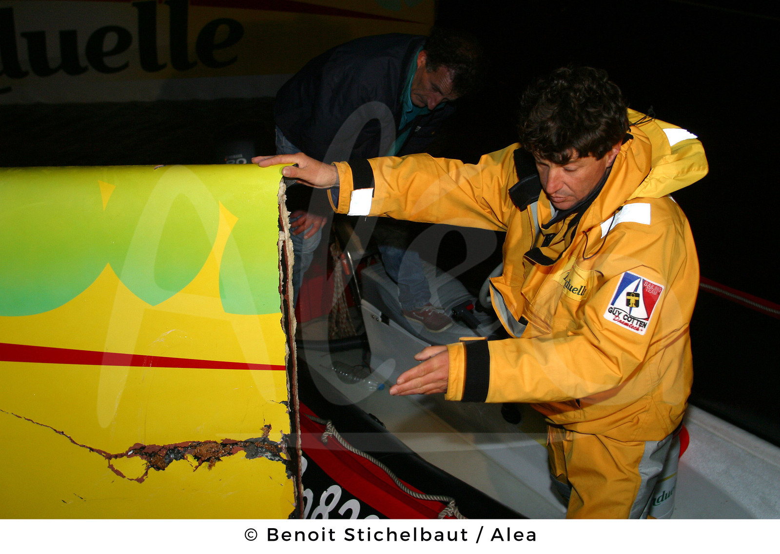| Description | SAILING - ROUTE DU RHUM 2002 - CAMARET (FRA) - BONDUELLE PIT-STOP - MULTIHULLS 60' ORMA - 11/11/2002 - PHOTO : BENOIT STICHELBAUT / ALEA.BONDUELLE / SKIPPER : JEAN LE CAM (FRA) - AFTER COLLISION WITH GROUPAMA CAPSIZED - JEAN DISAPPOINTED NOTES THE DAMAGES TO THE HULL BOW WITH HUBERT DESJOYEAUX (FRA) / CDK SHIPYARDS MANAGER |
