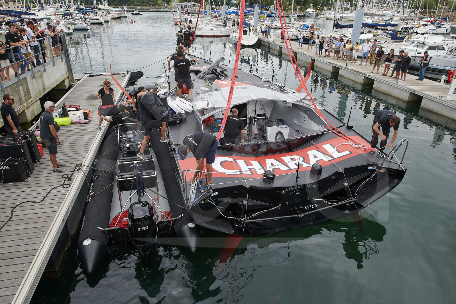 | Description | Launching of the new IMOCA CHARAL, skipper Jeremie BEYOU, at CDK shipyard in Port La Foret (France), on August 22nd, 2018 - Photo Yvan Zedda / Alea |