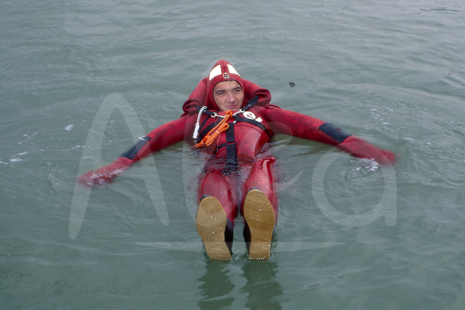 | Description | Bertrand de BROC, Groupe LG, trying dry suit before start of the round-the-world solo sailing yacht race Vendee Globe in Les Sables d'Olonne, West France, on November 20th, 1992 - © Bernard Rubinstein / Alea |