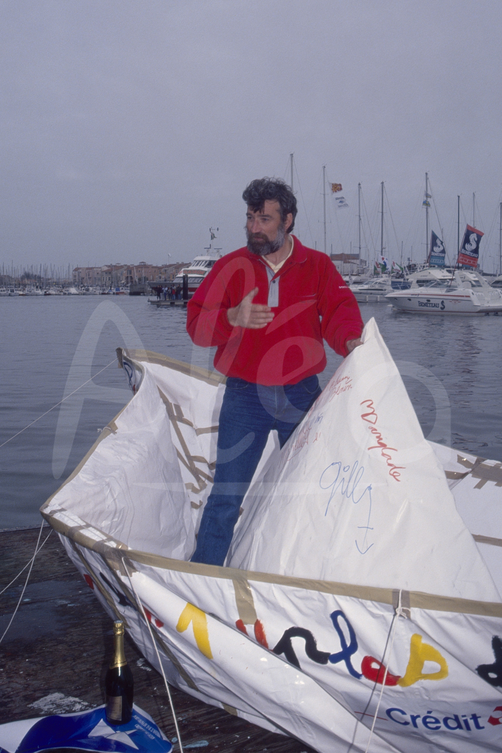 | Description | Jean-Luc VAN DEN HEEDE, Groupe Sofap Helvim, in a paper boat as a fake christening, before start of the round-the-world solo sailing yacht race Vendee Globe in Les Sables d'Olonne, West France, on November 20th, 1992 - © Bernard Rubinstein / Alea |
