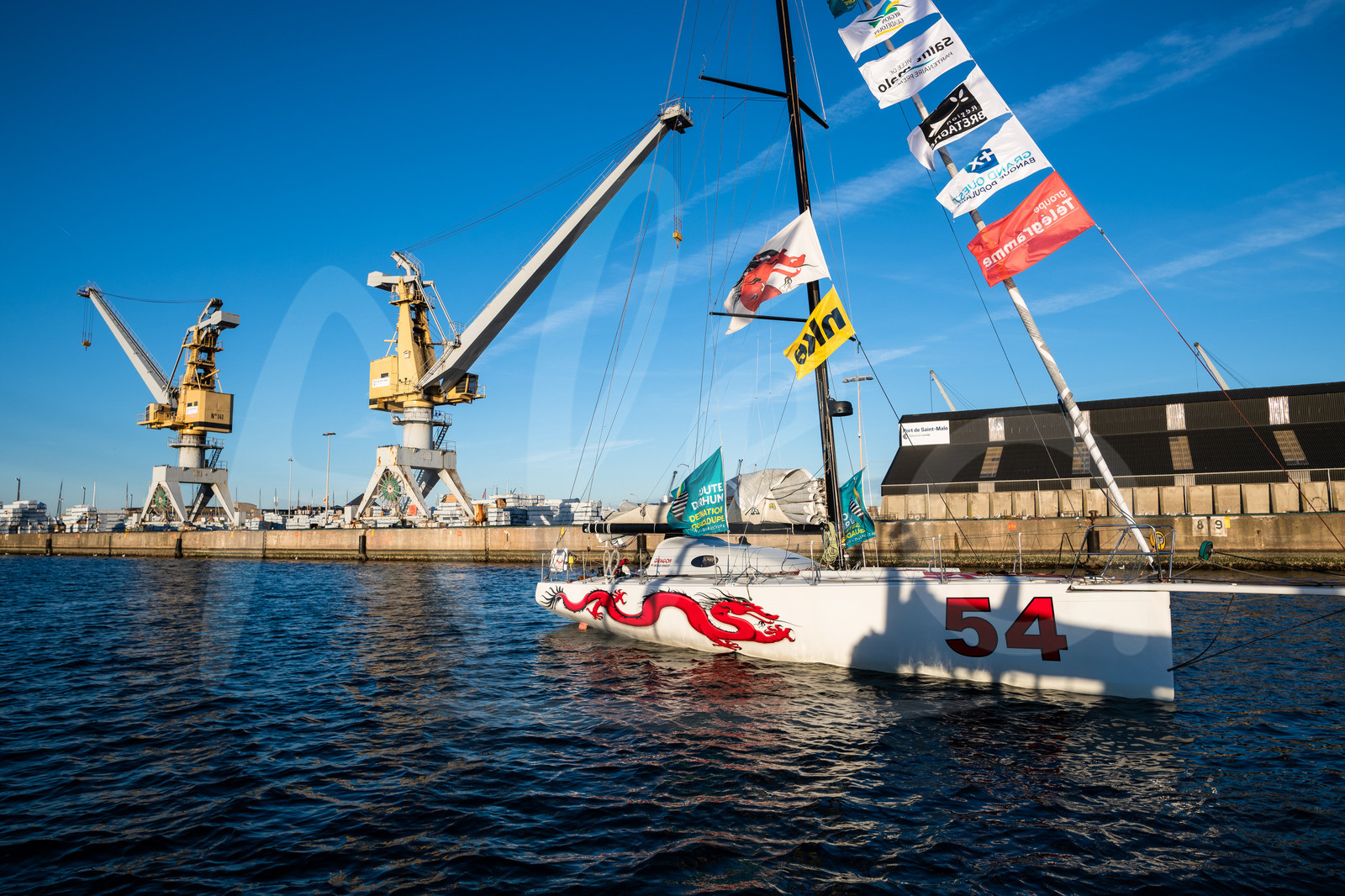 | Description | General view of the class 40 leaving pontoons to pass a lock towards moorings, they will spend the night before the start of the Route du Rhum 2018, on November 3rd, 2018 in St-Malo, north Brittany, France - Photo Jean-Louis Carli / Alea |