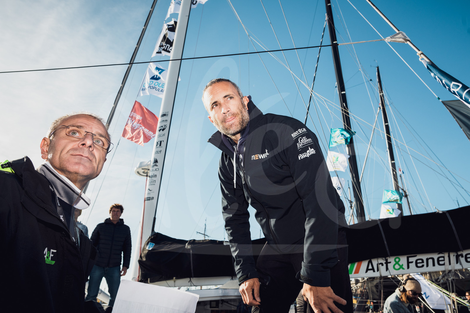 | Description | Christening by the DJ "Breakbot and Irfane", godfathers of IMOCA Newrest – Arts & Fenetres, skipper Fabrice Amedeo, together with Yohann Diniz, French race walker, during the pre-start of the Route du Rhum 2018, on November 3rd, 2018 in St-Malo, north Brittany, France - Photo Jean-Louis Carli / Alea |