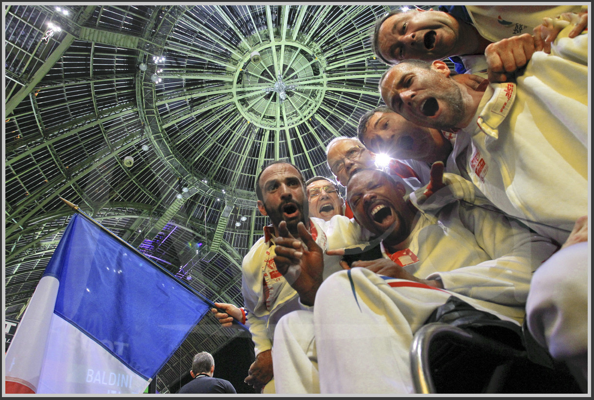 | Description | Illustration joie collective des escrimeurs français handisport lors des Mondiaux d’Escrime au Grand Palais - Photo Stéphane Allaman / Alea |